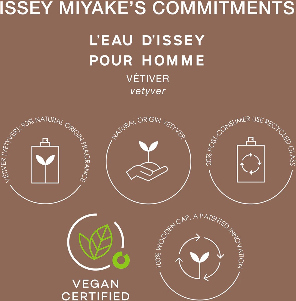 L’Eau d’Issey for Men Vetiver di Issey Miyake è un’acqua di toilette intensa certificata vegana, concepita per uomini, con un volume di 50 ml. Questo profumo si focalizza sulle note legnose di vetiver di Haiti, ottenuto in modo etico da agricoltori locali e composto per il 93 percento da ingredienti di origine naturale. Arricchito con zenzero speziato e salvia calda, offre una formula essenziale e lineare che si evolve sulla pelle. Il flacone è realizzato con vetro riciclato post-consumo al 20 percento, completato da un tappo in legno di frassino senza plastica in tonalità marrone, che simboleggia l’armonia tra acqua pura e legno autentico. È un’opzione cruelty-free che enfatizza sostenibilità ed elementi naturali, adatta all’uso da parte di adulti. Attenzione: infiammabile.