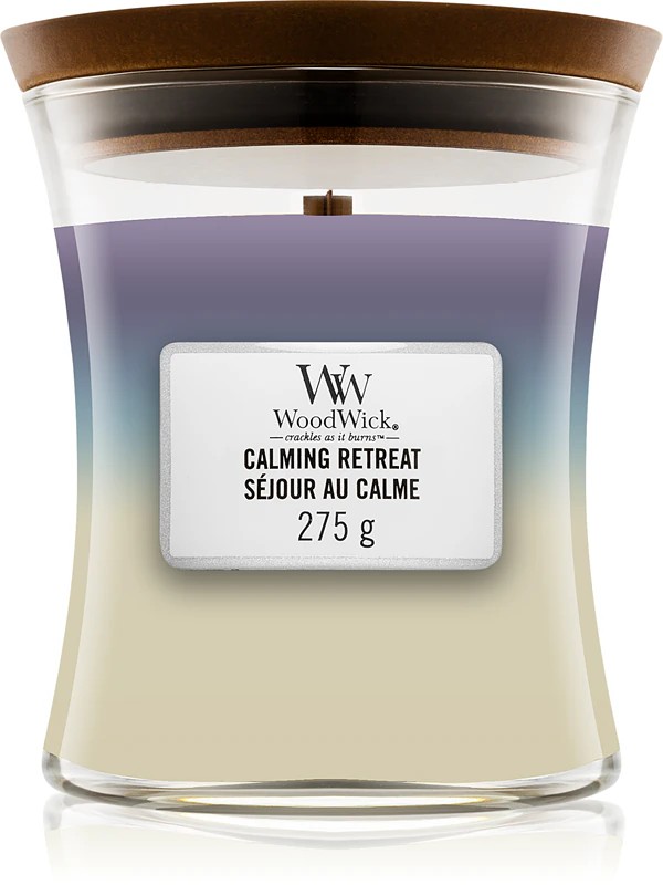 La candela profumata Woodwick Medium Hourglass Trilogy in fragranza Calming Retreat presenta un design unico a tre strati aromatici che combina le note di Lavender Spa, Sea Salt & Cotton e White Tea & Jasmine. Realizzata con cera di soia di alta qualità e alloggiata in un elegante contenitore di vetro dal diametro di 9,9 cm e altezza di 11,4 cm, questa candela premium è caratterizzata da uno stoppino in legno che produce un delicato crepitio durante la combustione, simile al suono di un caminetto, garantendo un tempo di bruciatura fino a 60 ore. Lo strato Lavender Spa offre note rilassanti di lavanda ed eucalipto, lo strato Sea Salt & Cotton presenta l’aroma calmante di brezze marine salmastre con sfumature di cotone e legno, mentre lo strato White Tea & Jasmine combina tè bianco puro con accenti di gelsomino miscelati con cedro rosso e rosa. Progettata per creare un’atmosfera tranquilla negli ambienti domestici, le fragranze stratificate si evolvono armoniosamente durante la combustione. Il contenitore in vetro ha una tonalità blu e mantiene una temperatura costante durante l’uso. La formulazione in cera di soia assicura una combustione pulita con produzione minima di fuliggine, rendendola adatta all’uso regolare in interni. Il design a clessidra aggiunge un appeal estetico all’arredamento domestico, mentre lo stoppino crepitante fornisce elementi di relax sia visivi che uditivi. Ogni strato brucia progressivamente, permettendo ai diversi profili aromatici di emergere durante l’intera durata della candela. Il prodotto pesa circa 680 grammi e contiene 453 grammi di cera. Questa candela è ideale per creare spazi rilassanti in soggiorni, camere da letto o aree meditative dove sono desiderabili illuminazione ambientale e aromi calmanti.