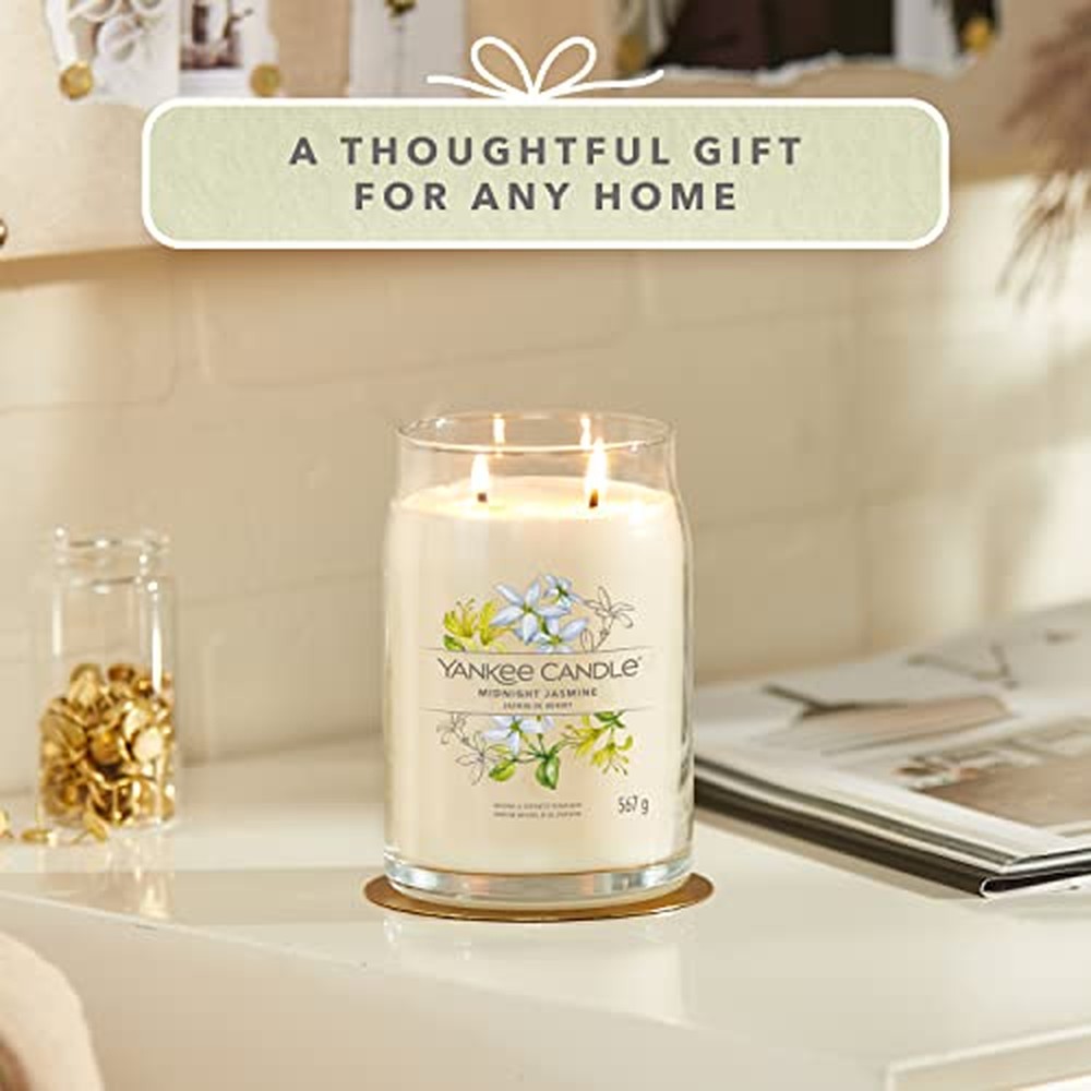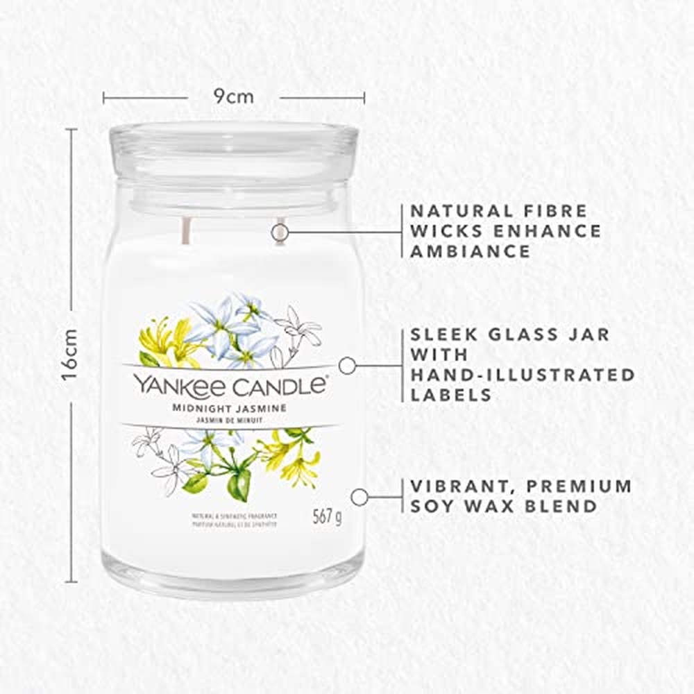 La Yankee Candle Midnight Jasmine Signature Candle è una candela aromatica di grandi dimensioni dal peso di 567 g, progettata per offrire un’esperienza olfattiva sofisticata e di lunga durata. Presenta un profilo aromatico complesso con note di testa di neroli, orantique, fiori di mandarino e pompelmo giallo, note di cuore di pompelmo e note di fondo di muschio e accordi polverosi, creando un aroma lussureggiante che ricorda il gelsomino acquatico e il dolce caprifoglio. Realizzata con una miscela premium di cera di soia e ingredienti autentici, garantisce una combustione pulita e uniforme con colori vivaci. La candela è contenuta in un elegante barattolo di vetro con diametro di 9,3 cm e altezza di 15,7 cm, finito con disegni illustrati a mano che si adattano a vari stili di arredamento. Dotata di doppio stoppino in fibre naturali al 100%, migliora l’atmosfera e diffonde la fragranza in tutta la stanza. Con un tempo di combustione fino a 90 ore, è adatta per creare un’atmosfera rilassante in soggiorni, camere da letto o uffici. Per prestazioni ottimali, lasciare che la candela raggiunga la temperatura ambiente prima dell’uso, assicurarsi che l’intera superficie di cera si sciolga formando una pozza per il massimo rilascio della fragranza e tagliare sempre lo stoppino a circa 3 mm prima dell’accensione. Le linee guida di sicurezza includono posizionarla su una superficie piana e resistente al calore lontano da correnti d’aria, tenerla fuori dalla portata di bambini e animali domestici e non spostarla mai mentre è accesa o prima che la cera si solidifichi. Quando rimangono circa 5 mm a 10 mm di cera, è il momento di considerare il riciclo del barattolo. Questo prodotto unisex è ideale per l’uso da parte di adulti e aggiunge un tocco di eleganza a qualsiasi ambiente.