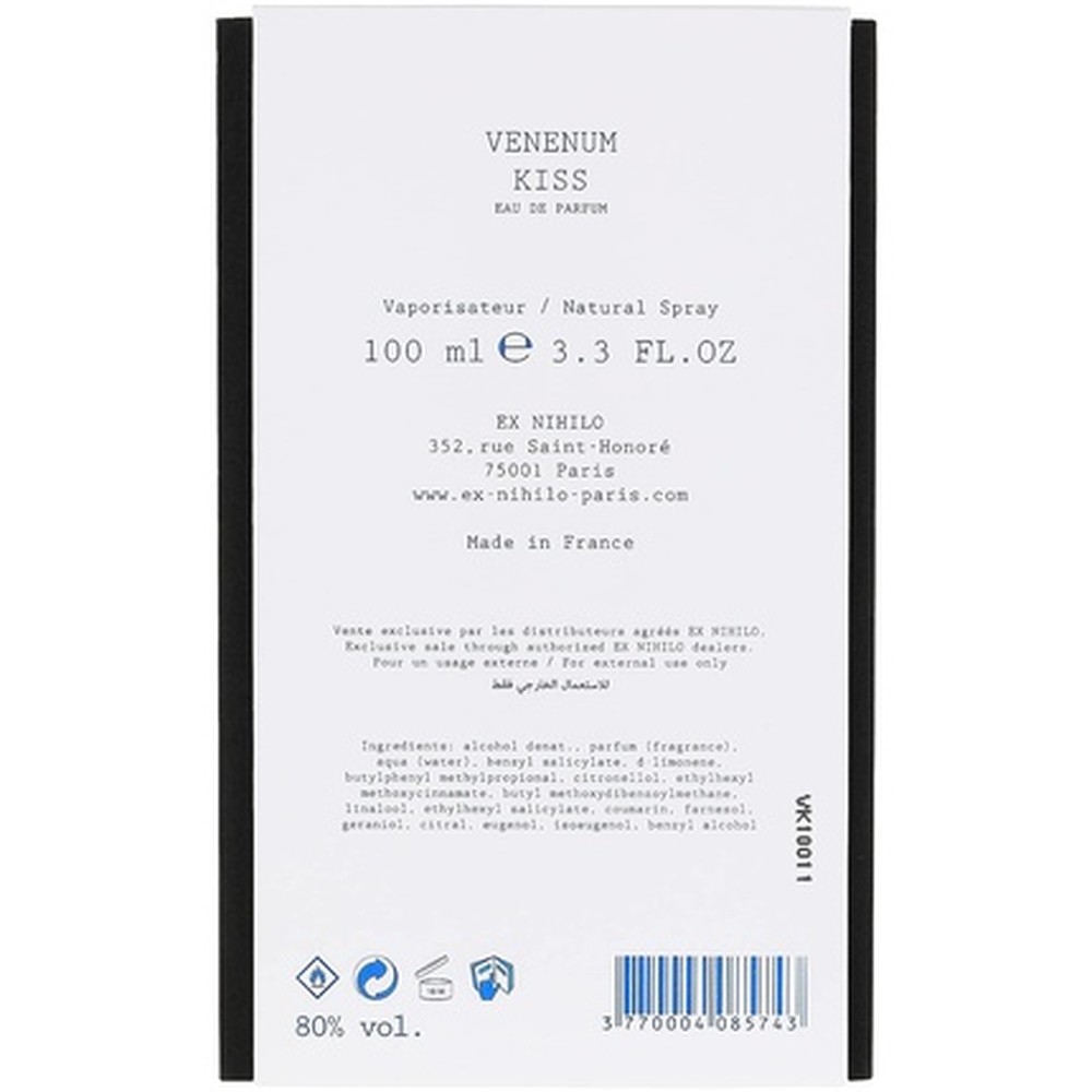 Ex Nihilo Venenum Kiss Eau de Parfum Spray è una fragranza unisex lanciata nel 2015, creata dal profumiere Quentin Bisch. Questa eau de parfum presenta un profilo olfattivo complesso con note di testa di zafferano, noce moscata e neroli (fiore d’arancio), note di cuore di rosa, ambra e artemisia dracunculus, e note di fondo di vaniglia, sandalo e resina di benzoino (styrax benzoin). Il flacone spray contiene 100 ml di fragranza, progettato per adulti che cercano un aroma sofisticato e duraturo. La composizione unisce elementi caldi, speziati e floreali, offrendo un’opzione versatile per l’uso quotidiano o per occasioni speciali. Il prodotto è disponibile in una dimensione standard senza colore specifico, con enfasi su ingredienti di qualità e un’esperienza olfattiva bilanciata e di lunga durata. La fragranza combina sapientemente le note speziate iniziali con la dolcezza floreale del cuore e la profondità legnosa del fondo, creando un profilo aromatico che evolve elegantemente nel tempo. La selezione degli ingredienti privilegia materie prime di alta qualità per garantire persistenza e proiezione ottimali. Il flacone è realizzato con attenzione ai dettagli funzionali, assicurando un’applicazione precisa e uniforme della fragranza. Adatto per diverse occasioni e stagioni, mantiene le sue caratteristiche distintive pur adattandosi alla pelle di chi lo indossa. La complessità della composizione si rivela gradualmente, offrendo sfumature diverse durante le diverse fasi di evaporazione. L’equilibrio tra le note speziate, floreali e legnose crea un insieme armonioso che risulta contemporaneamente intrigante e accessibile.
