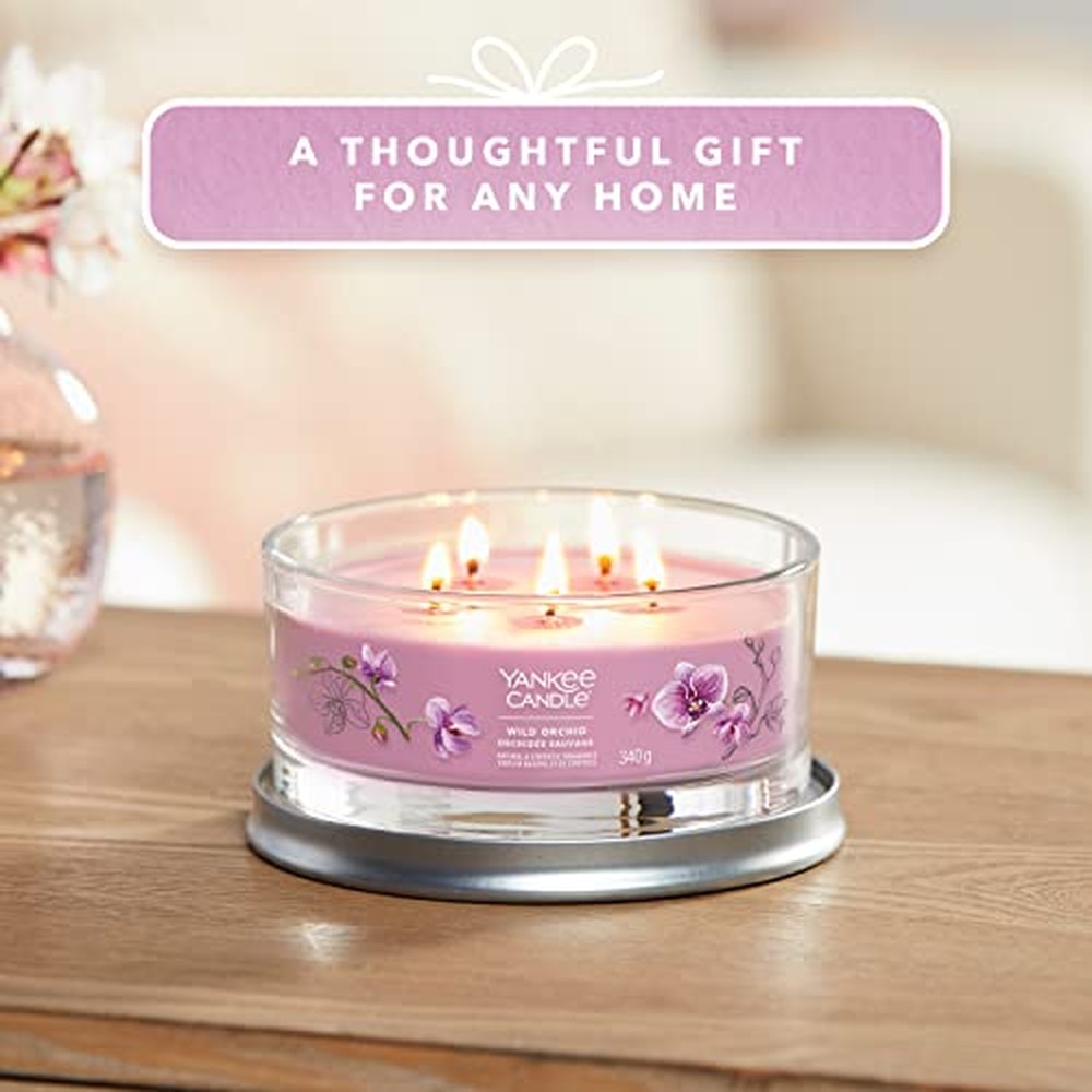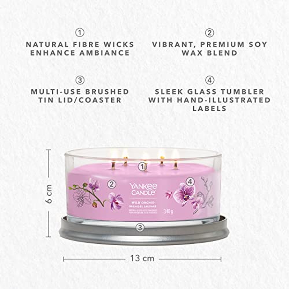 La candela Yankee Candle Wild Orchid Signature Tumbler offre un’esperienza olfattiva coinvolgente grazie al sofisticato design a cinque stoppini e alla miscela premium di cera di soia. Questa candela da 340 g, contenuta in un elegante bicchiere di vetro viola con diametro di 13 cm e altezza di 5,8 cm, presenta disegni botanici illustrati a mano che si integrano perfettamente con l’arredamento domestico. Il profilo olfattivo complesso si sviluppa con note di testa di ozono solare, fiore di mandarino, bergamotto e foglia di palma, evolve verso note di cuore di orchidea selvatica, ibisco, nettare di fragola, gelsomino e fiore di banana, per concludersi con note di fondo di muschio fruttato, sandalo e ambra bianca. Realizzata in vetro di alta qualità con cinque stoppini in fibra naturale, questa candela garantisce fino a 28 ore di combustione costante se utilizzata secondo le indicazioni del produttore. La miscela premium di cera di soia assicura una combustione pulita e uniforme con produzione minima di fuliggine, mentre la configurazione multipla di stoppini crea una diffusione fragrante sostanziale adatta a stanze di medie e grandi dimensioni. La corretta manutenzione della candela prevede di lasciarla raggiungere la temperatura ambiente prima del primo utilizzo, assicurarsi che l’intera superficie di cera si sciolga completamente durante ogni sessione di combustione, mantenere la lunghezza degli stoppini a circa 3 mm e posizionarla su una superficie stabile e resistente al calore lontano da correnti d’aria. La candela dovrebbe essere sostituita quando rimangono circa 5-10 mm di cera. Il design a bicchiere non solo migliora la distribuzione della fragranza ma funge anche da elemento decorativo che può essere riutilizzato dopo l’uso. Questo prodotto di classe energetica A combina ingredienti fragranza autentici con caratteristiche di prestazione affidabili per un godimento costante della fragranza domestica.